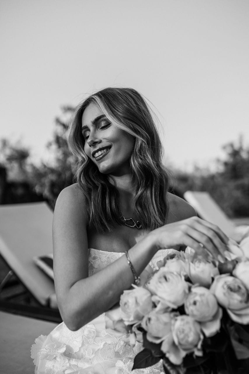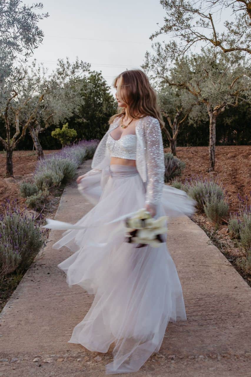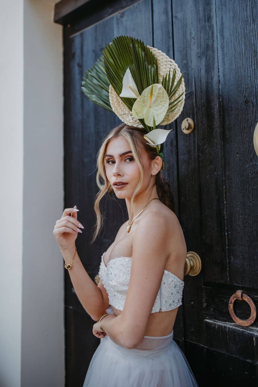 For bridal fashion, this opens the door to individuality. Corseted silhouettes, layered skirts, oversized veils and sculptural headpieces are appearing more often as brides look to express their own sense of style rather than follow a traditional formula. Personally, I love pearl headpieces with a subtle nod to the 1920s Gatsby era, elegant hats, oversized florals woven through the hair, and pieces we haven’t yet seen widely across Ibiza weddings.”